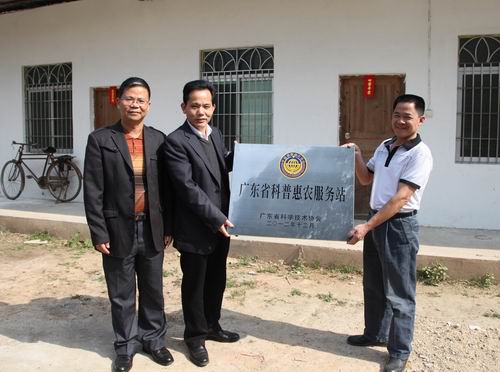 图为茂名市委组织部副部长、调研员周国新(左二)和茂名市科协主席蔡映秋(左一)向信宜市都合农民专业合作联社颁发“广东省科普惠农兴村服务站”牌匾