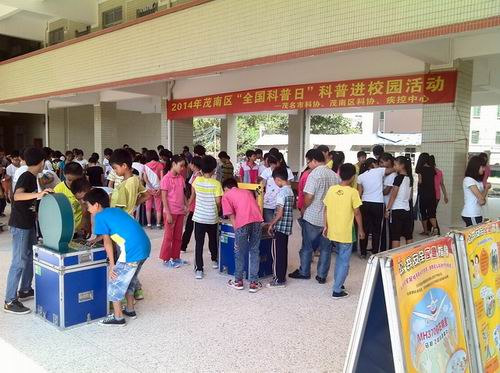 在每个活动现场展出的20多件科普大篷车科普宣传展品,学生、村民们都兴致勃勃地参与科普展品操作和体验活动,通过这些趣味性、科学性和可操作性的科技展品,使他们亲身感受到了科学知识带来的快乐,品味科普的魅力,极大地开发了他们的智力、开阔了他们的眼界、激发了他们学科学、爱科学、用科学的兴趣。同时,现场展出了“关注食品安全,保护身体健康”、“公共安全应急指导”、“气象与生活科普知识”、“科学用电、低碳节能”、“2014年茂名市青少年科技创新大赛优秀作品展”等科普专题展板。现场还派发了“消防防火安全”、“突发地震灾害如何应对”、“雷电冰雹灾害预防”、“预防溺水安全”等科普宣传小册3000多份。