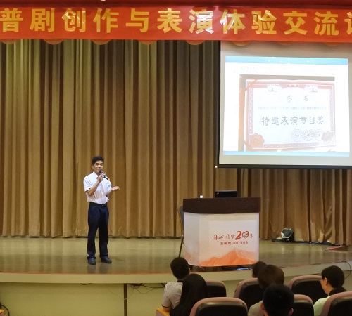 在2017年“全国科普日”活动启动仪式上,省科协党组成员、副主席吴焕泉同志代表主办单位发言,接着与会的2000余人参加了广场科普活动。在专家讲座环节,中国科学技术协会科技基层处调研员张守慎进行了《全民科普日的组织》的讲座,广东省艺术研究所副所长黄海忠《科普剧的创作与表演漫谈》的讲座;在科普剧表演环节,东莞科技馆的《防与放》表演;在经验分享环节,清远市代表汤锦洪副校长作了题为《从零起点到区域引领》的经验介绍,通过生动的事例、图片、视频分享了清城区科普剧近两年多来从零起点到引领粤北地区科普剧发展的过程以及做法,受到与会者的好评。