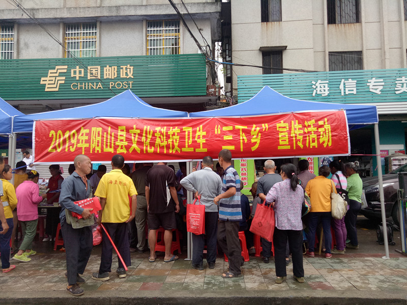 5月20日,由中共阳山县委宣传部、阳山县科协牵头组织阳山县文广旅体局、阳山县农业农村局、阳山县卫生健康局、阳山县气象局、阳山县林业局、阳山县司法局、阳山县水利局、共青团阳山县委、阳山县妇联等部门联合开展2019年文化科技卫生“三下乡”活动在江英镇举行了启动仪式。