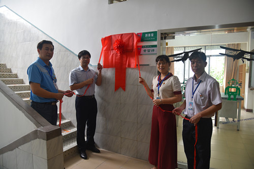 随后,蓝建飞一行来到飞来湖中学,参观了机器人创客工作室,看到了同学们亲自动手制作各类模型、无人机操作、机器人现场拼接制作等,他们对飞来湖中学如此成功的开展创客课程给予了高度肯定。最后由蓝建飞、谢东山为该校的“清城区青少年科技创客工作室”揭幕。