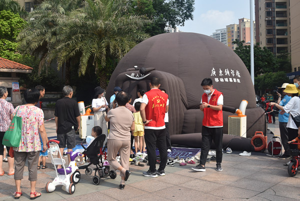 本次巡展活动主要分为“科普展览”、“科普影视”和“科普互动”三大展区,展出60余件互动体验展品,涉及多学科领域。在“科普展览”区域,展示了声光电、数理化等多类型的科技信息展品和大疆智能机器人,让居民在互动体验中学习科学知识,感受科学探索过程的乐趣,提升对科学的兴趣;广东科学馆在“科普影视”区域带来了充气式移动球幕影院,以新颖的展示内容和方式,带给居民强烈的感官冲击和观影体验,丰富居民的科学文化生活;“科普互动”区域现场则设置科普知识趣味问答游戏和益智展品,通过趣味性和互动性的方式,开发青少年智力,培养学习自信心,使居民在寓教于乐中掌握科普知识。