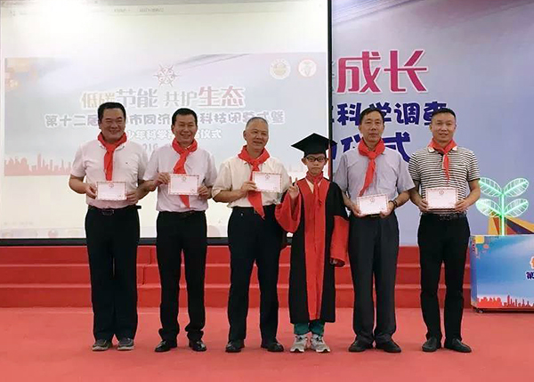 童童少年科学院院长(右三)向省、市、区科协领导颁发校外顾问证书