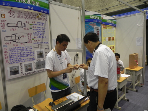 获金牌的谢明轩老师向评委介绍科技教师项目《定量药粉喷瓶》