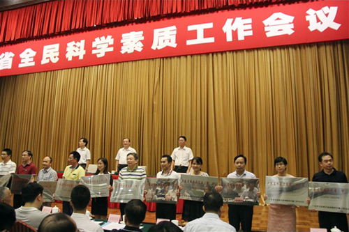 谭志东(右三)接受2016-2020年度“广东省科普示范县(区)”牌匾