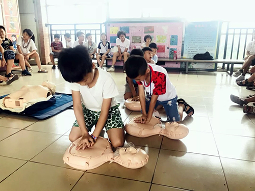 “老师等一下,我还没记好。”到底是什么课程内容?让小朋友们这么积极地记起了笔记呢?原来是7月20日佛山市第二人民医院的胡蛟龙主治医生在给小朋友们上急救知识课程。“同学们,遇到有人受伤或者晕倒,我们要不要帮助他/她呀?”教室异口同声地回答“要!”“好,同学们都是好孩子,但我们不仅要见义勇为,还要见义智为哦。”胡老师不仅给同学们讲了观察救人现场环境,打电话呼救等细节,还手把手地教小朋友心肺复苏。一讲到气道梗阻,同学们就更兴奋了,这是怎么回事?原来呀,海姆力克急救法在昨天的学习中已经让大家印象深刻,大家纷纷举手要给老师展示自己不久前学到的新知识。还真是一群既好学又记性好的小朋友。