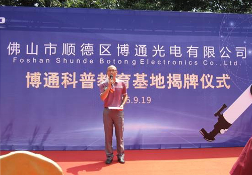 2016年9月19日上午,佛山市顺德区科学技术协会在佛山市顺德区博通光电有限公司举行科普教育基地揭牌仪式。佛山市顺德区容桂街道经促局、广东天文学会、顺德一中等15家中小学以及20多家博通光电合作企业参加了本次揭幕仪式。佛山市顺德区科协秘书长蔡汉华,广东天文学会理事刘华致辞,佛山市顺德区博通光电有限公司总经理黎翠银、副总经理杨建东代表基地进行讲话。