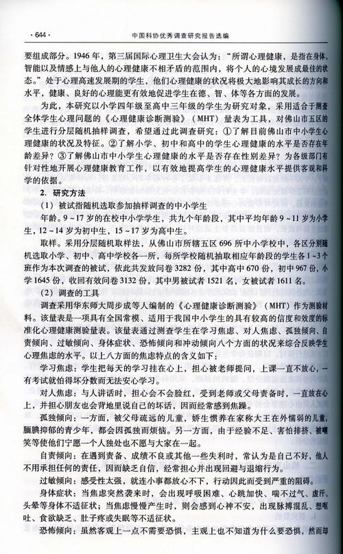 《佛山市未成年人心理发展状况调查研究报告》历时两年完成,是佛山市科协和市妇联于2005年12月联合启动的调研课题。佛山市心理学会是本课题的承担单位。2006年1月,市心理学会成立了由副教授、高级讲师、副主任医师等专家组成的课题调研组。课题组在全市五区随机选取33所中小学校,通过问卷调查、座谈等方式采集相应年龄段学生9000多人次的被试样本12000多份(约占全市中小学校各年级学生总数的1%),在对大量数据进行统计分析处理后,于2006年底先后完成心理健康、思想道德、人际关系、学习适应性等四个子课题报告,并于2007年5月完成总报告。根据调研分析情况,调研报告还提出提高中小学校心理健康教育水平、提高家庭教育水平、关注女性未成年人的困境与心理压力等五项建议,得到了政府有关部门的重视和采纳。
