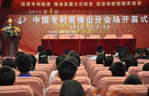 以“运用专利制度,推动发展方式转变,促进创新型国家建设”为主题的2010·第四届中国专利周活动启动仪式2010年11月7日上午在佛山市分会场佛山科学馆举行。来自佛山市各区科技界、法律界、教育界和知识产权管理、中介机构等各部门的代表一百多人参加了活动。