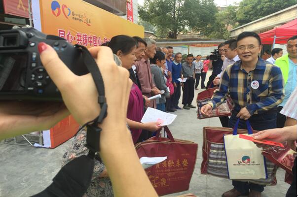 图为:市科协副主席周平(前)、韶关学院医学院副院长王江桥(后)为精准扶贫困难人员发放慰问品和红包一份。