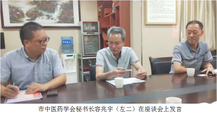 座谈会上,容兆宇秘书长向黄端鹏副主席汇报了市中医药学会的相关工作,详细介绍了市中医药学会今年来的学会工作情况及工作设想。市中医药学会成立于2000年1月26日,目前有单位会员11家,包括各县市区中医院、粤北医院及韶关市第一人民医院。近年来,市中医药学会积极开展义诊、中医药特色的活动,在中医药学术交流、承接政府职能的考务和咨询、中医药人才培训等工作取得了一定的成绩。2019年12月13日,韶关市中医药学会荣获广东省中医药学会先进市级中医药学会。