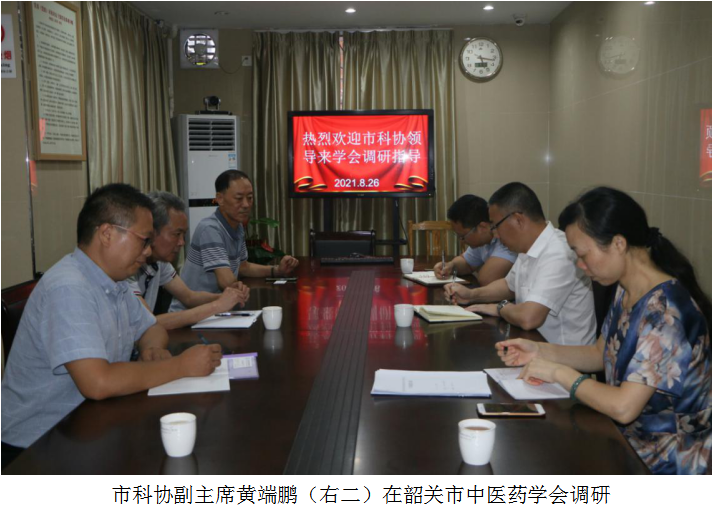 8月26日,韶关市科学技术协会黄端鹏副主席一行3人到韶关市中医药学会进行走访调研。市中医药学会容兆宇秘书长对黄端鹏副主席的到来表示热烈欢迎。