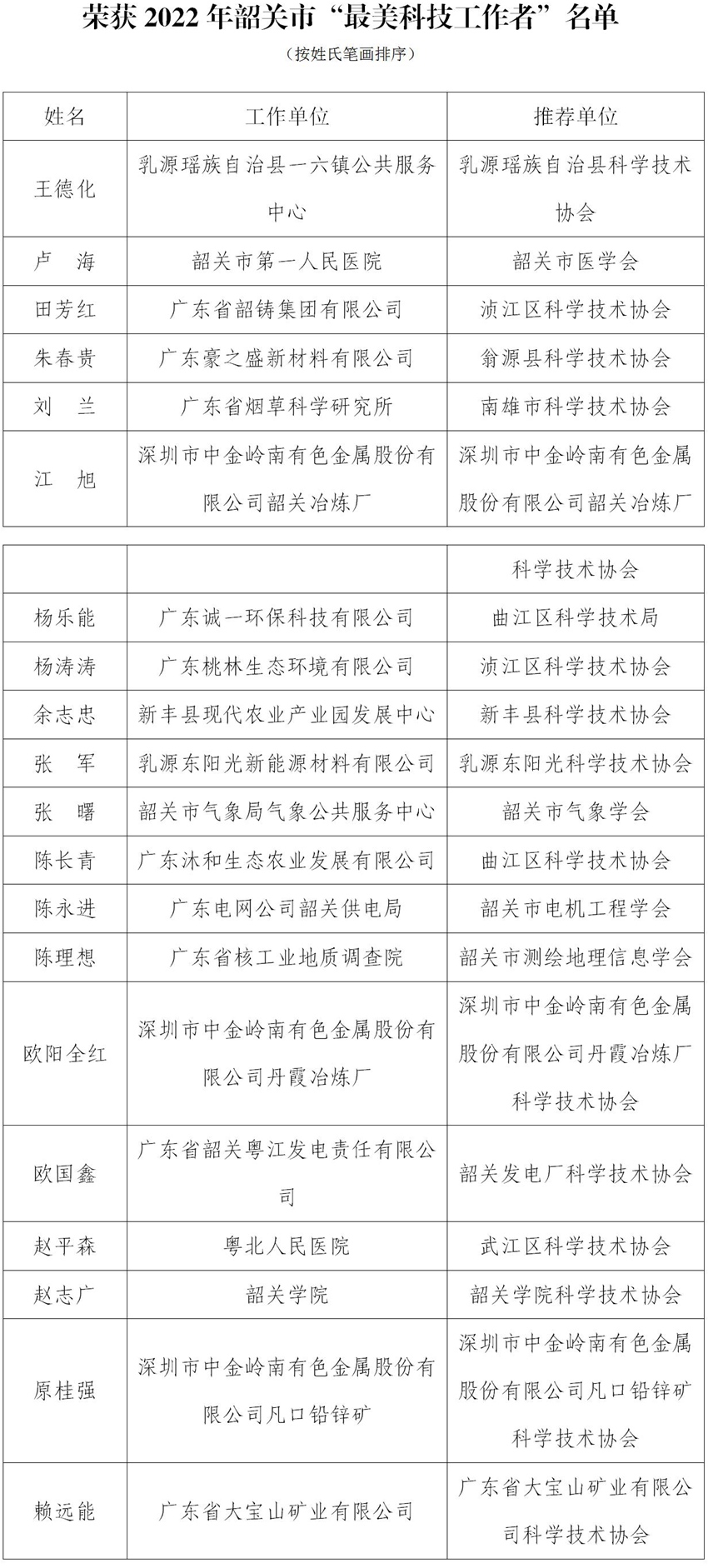 经过广泛发动、层层推荐、综合评审、组织审查及社会公示等程序,王德化等20人被评为2022年韶关市“最美科技工作者”。