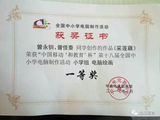 第十八届全国中小学电脑制作活动决赛现场答辩于7月18-22日在浙江嘉善举行,汕头市澄海区道南小学学生曾永钏、曾佳泰制作的电脑绘画作品《采莲藕》夺得小学组一等奖。澄海区连续三年都有学生获得现场决赛资格,并且均获得一等奖。