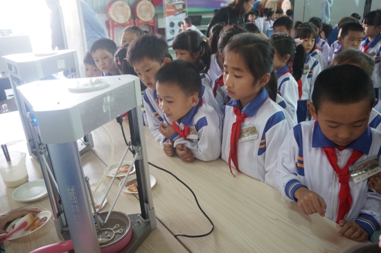 在3D打印区,时不时就传来一阵香味。原来是我们的3D食品打印机正在为“吃货”同学们烹饪美味的食品——3D打印饼。同学们翘首以待,看着机械臂不停地摆动,一点点地将卡通3D饼打印成型,口水都快留到地上啦!