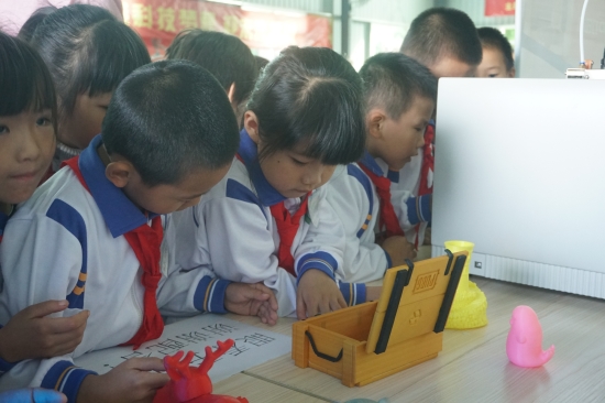 隔壁的3D建模机也是“宾客满座”,同学们带着求知的眼神,认真地观察3D模型是如何制作出来的。科技辅导老师也实时向同学们讲解其中的科学原理与用处。想建造属于自己的3D产品,同学们可要好好地学习哦!