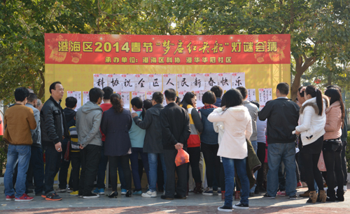 大年初一,汕头市澄海区委、区政府在府前广场举办2014春节“梦启红头船”灯谜会猜活动,澄海区科协和澄华街道华冠社区联合承办一台科普灯谜。区委书记陈向光、区长柯茂等区各套班子领导现场观看了本次灯谜会猜活动,同广大市民一起欢庆新春佳节。