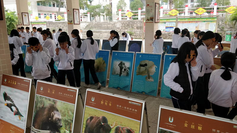 活动中,学校展示着3D立体科普展板,学生们兴致勃勃地戴上立体眼镜,进入神秘而有趣的立体图像世界。他们就像观看3D电影般欣赏着动物、自然生态、海洋世界等一个个栩栩如生的画面。活动中共展出科普展板100块。