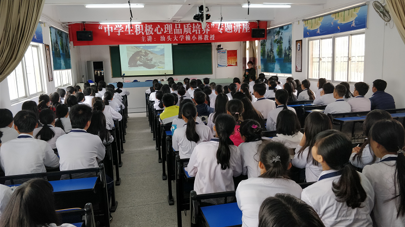 汕头大学心理学教授、研究生导师、中国科协“做中学”科学教育改革实验项目教学中心专家委员会赖小林教授作题为“学生积极心理学品质培养”的心理健康讲座,从心理健康的诊断标准、学生常见适应问题、怎样应对压力等方面展开讲述,以讲课、互动、咨询等形式为学生及教师进行了心理健康教育。赖教授语言生动、简单实用,讲座现场学生踊跃参与互动,并现场咨询,场面气氛浓烈,提高了师生的心理承受能力,进一步营造了和谐美好校园氛围。