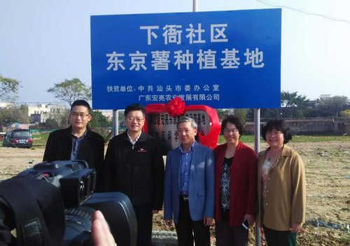 在调研现场,张应杰对濠江区下衙社区引进广东宏亮农业发展有限公司开展东京薯种植帮助社区和村民脱贫的做法予以肯定,并在濠江区区长秦波的陪同下,为濠江区宏亮东京薯科普示范基地揭牌。