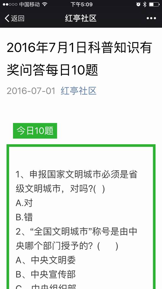 汕头市金平区同益街道红亭社区通过微信平台举办“科普有奖知识问答”活动