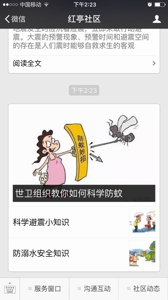 “红亭社区”公众号于2014年5月开通,是红亭社区创新便民服务的新举措,是将科学技术融合到居民服务的新尝试。开通以来居民只要通过微信扫一扫添加关注,便可了解计生、劳保、民政等办事指南和一系列惠民政策,同时也可向居委会预约办事、反馈意见,也成为居务公开的新途径,以“指尖服务”搭建起社区居委会联系群众的桥梁纽带。今年以来,红亭居委会把进一步拓展微信公众号功能提上议事日程,结合申报市科普示范社区工作,将其作为科普宣传的新渠道,在公众号开设“科普园地”,开展了消防安全、防震减灾、法律知识等形式多样的宣传。此次科普知识有奖问答,是发动社会力量投入科普宣传的新尝试,既拓宽了科普宣传渠道,又丰富了辖区居民科学文化知识。