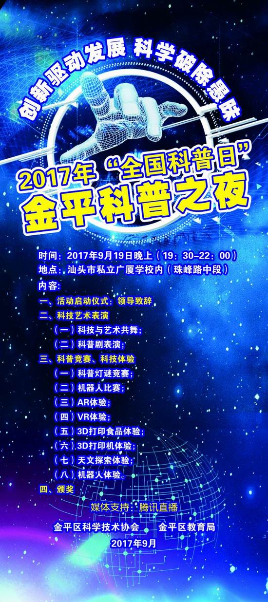 接下来金平区科协在 9 月 19 号晚上将举办“全国科普日”“金平科普之夜”科普活动,活动现场有科技艺术表演、科普剧表演、科普灯谜竞赛、机器人比赛、 AR 体验、 VR 体验和 3D 打印体验等,全程由腾讯公司现场直播,敬请关注。