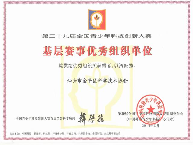 汕头市金平区科协获评全国青少年科技创新大赛优秀组织单位 2014-10-17 来源:汕头市金平区科协 【字体:小 大】 阅读: 次 2014年8月21至26日,由中国科协、教育部、科学技术部等8部委共同主办的第29届全国青少年科技创新大赛在北京园博园举办。汕头市金平区科学技术协会获得第29届全国青少年科技创新大赛基层赛事优秀组织单位称号。 分享到: