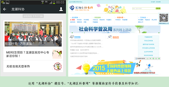 龙湖区选准要点,重拳出击,以宣传攻势在全区迅速掀起创建热潮。创建期间,先后在《汕头日报》和《汕头特区晚报》上分别做了“创建科普示范品牌,助力经济社会发展”和“创新驱动、科教兴区、为经济社会发展提供源源不断动力——龙湖区打造品牌冲刺科普示范区”的科普系列专题专版报道,以强有力的宣传手段,刷新科普宣传纪录,迅速扩大影响力,在社会上引起热烈反响;开通“龙湖科协”等微信公众平台,运用新媒体手段突出科普宣传的时效性。