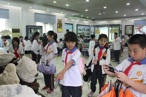 学生们在珍珠产品展示厅观看海底化石,学习海洋科学知识