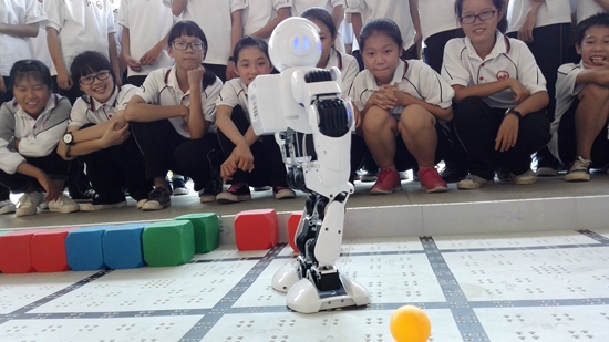 学生们被萌萌的机器人“阿尔法”逗乐了