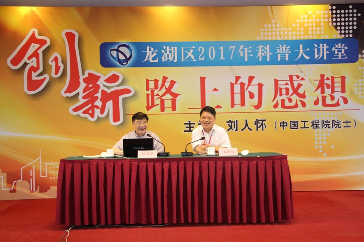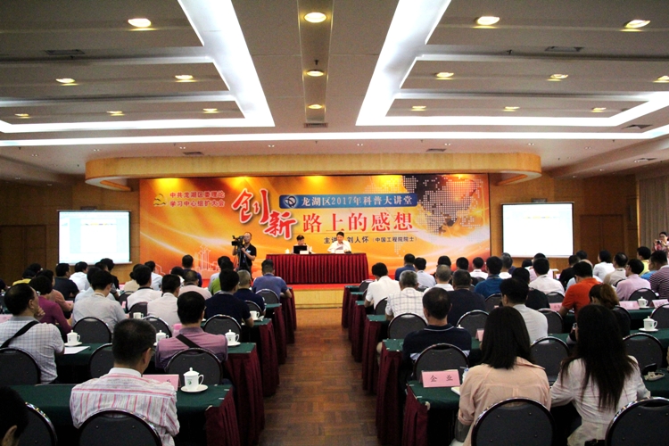 为全力推动创新驱动发展战略,加快打造创新之区,营造更加浓厚的创新创业氛围,龙湖区专门邀请了中国工程院院士、暨南大学原校长、省科协原副主席刘人怀教授开展“院士龙湖行”科普论坛等活动,以区委理论学习中心组扩大会的方式,组织了该区四套班子在家领导、区直机关及街道(镇)主要负责人、有研发机构及涉及创新领域的高新技术企业200多人参加了院士讲座。