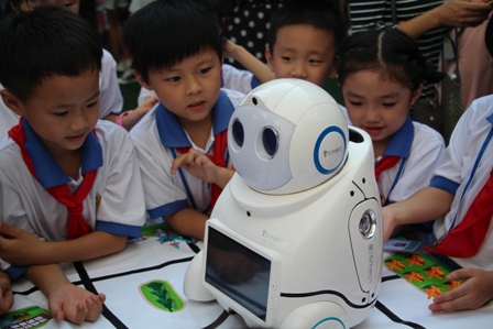 在机器人展示现场挤满了前来大开眼界的同学们和家长们。随着动感的音乐响起,机器人们开始有节奏地舞动起来,它们一会儿举起右手,一会儿将双手伸直,动作时慢时快,可爱地摆动着,把全场的观众都逗乐了,“萌”得让同学们忍不住跟着跳起舞来。在活动的另一边,圆圆的脑袋,会转动的眼睛,萌萌哒的“小优”,让同学们爱不释手,大家围绕在小优身旁,讲故事、教拼音、对话,“小优”瞬间变身可以和孩子玩耍的小伙伴。各式各样的机器人,让同学们感受到了科技带来的震撼与魅力。