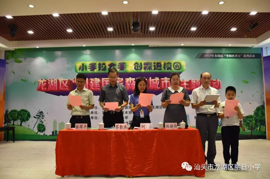 随后,丽日小学还选取了学生代表,带领师生们一起宣读《创建国家森林城市倡议书》,朗朗之声铿锵有力,师生们用声音传递信念,将努力做“创森”的践行者、宣传者、实践者与引领者。
