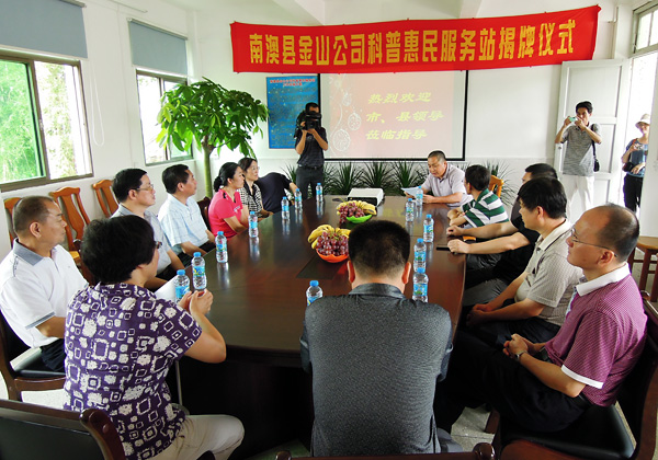市科协党组副书记、副主席洪子敏在仪式上作了重要讲话,他指出:“科普惠农服务站”建设是实施“科普惠农兴村计划”的一项重要内容,是建立科普惠农服务长效机制的重要保证,是完善农村新型科技服务体系的重要举措。他强调,多方整合资源,拓宽工作渠道,创新科普手段,丰富科普内容,提升科普能力,把“科普惠农服务站”打造成农村科普公共服务平台,为会员和周边农民提供及时、周到、长期、有效的科普服务,不断提高“科普惠农服务站”的社会影响力和惠及农民。在鸣放礼炮的喜悦欢腾中市科协党组书记洪建芬和南澳县政府董运涛副县长为 “金山农业发展有限公司科普惠农服务站”揭牌。