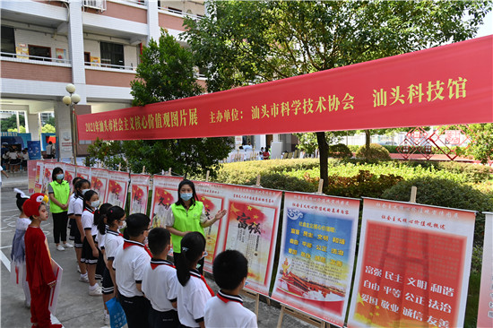 汕头科技馆现场举办《百年回望:中国共产党领导科技发展》《社会主义核心价值观》图片展,向参观者耐心讲解宣传内容。