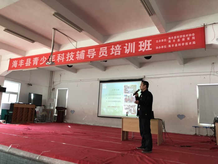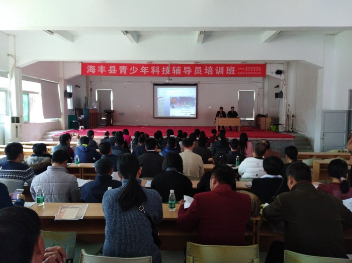 为提高海丰县青少年科技教育水平,促进全县青少年科技创新活动不断进步,推动全县青少年科技教育工作持续发展,12月8日,汕尾市海丰县科协、县教育局和县科技局在县少年宫举办海丰县青少年科技辅导员培训班。来自全县中小学校60多位骨干教师参加了培训。汕尾市科协常务副主席范志能,海丰县科协、教育局、科技局等相关领导出席了培训班。培训班邀请了全国“十二五”全民科学素质行动计划纲要实施工作先进个人、广东省青少年科技中心主任叶新鹏同志为培训班学员进行辅导授课。
