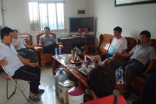 图为:海丰县科协主席罗建奇(左三)向村委干部了解灾情