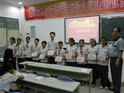 颁奖活动在锦江实验小学电教室举行,该校校长温昆伦主持,陆丰市科协主任科员叶花、碣石镇中心小学校长陈纪雄分别作了讲话,陆丰市科协副主席黄曲萍等领导为该校荣获“第二十八届广东省、第十一届汕尾市青少年科技创新大赛”22个奖项的师生颁发奖牌和证书。