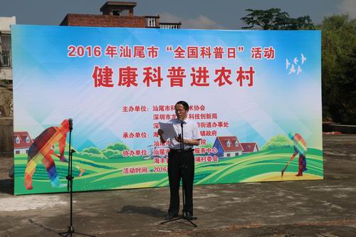 9月23日上午,由汕尾市科协、深圳市龙岗区科创局、深圳市龙岗区坂田街道办事处、汕尾市第二人民医院、海丰县赤坑镇政府共同举办的2016年汕尾市“全国科普日”活动—“健康科普进农村”在赤坑镇下埔村拉开了序幕。市科协常务副主席范志能、专职副主席洪羿、海丰县赤坑镇党委及下埔村委等相关领导出席启动仪式。