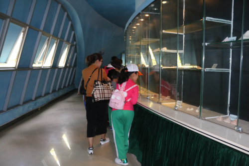 学生和家长在海龟科普馆观看标本