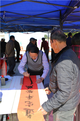 活动安排为乡亲们送发春联、科普资料;邀请书法家为乡亲们现写春联。在现场,村民纷纷来到活动现场,书法家们根据大家的不同需求,热情地为村民书写各种春联,行书、楷书、隶书等各种字体跃然纸上。在送春联活动同时,还为村民发放了《公众日常科技知识读本》和《新时期农村基层工作科技知识手册》等书籍200余本,并将科普大篷车开进村内,让广大村民现场体验力学、光学、电学、生理学等科普展品。此次文化、科技进农村集中服务活动,深受村民欢迎。为推动农村精神文明建设,提高农民科学文化素质、健康素质,建设美丽宜居乡村提供了强大的精神力量,也为下一步精准扶贫和创文工作的顺利推进打下了良好的群众基础。