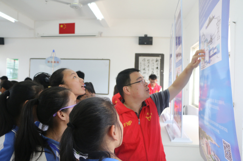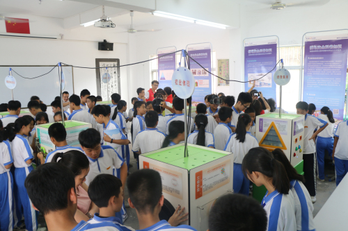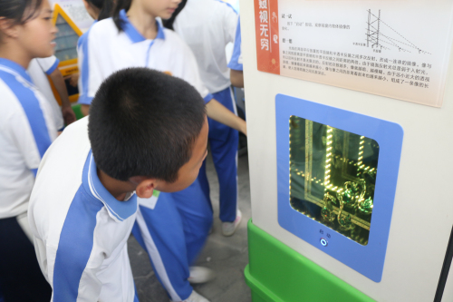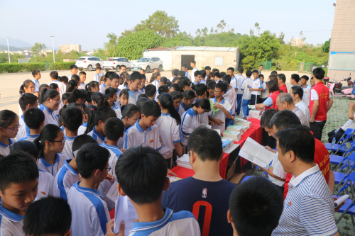 启动仪式结束后,在汕尾市科协和陆丰核电有限公司发放科普书籍专区前瞬间挤满学生,同学们争相领取了科普书籍并融入到知识的海洋里。由汕尾市科技馆和陆丰核电有限公司摆放的科普大篷车车载展品、展板专区,同学们对VR体验、健康生活、视觉体验、电磁与材料、机械传动、运动与力等科普内容迅速充满好奇。在每部科普设备前都是人头攒动,这些科普展品能将科学原理、科学现象直观地展现在同学们面前,让同学们亲身体验到科技的神奇,感受到科学带来的快乐和进步。而在展板面前,不时有学生询问核电科普志愿者关于核电安全和原理方面的疑虑和知识。