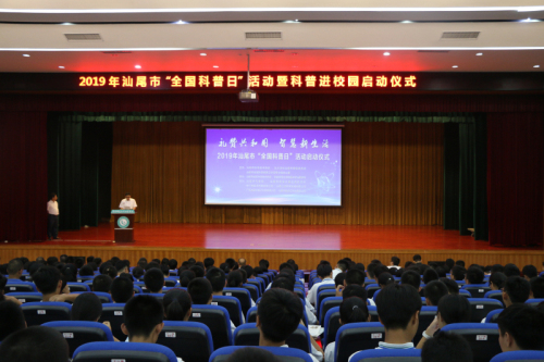 9月18日下午,在华南师范大学附属中学汕尾学校礼堂,举行了主题为“礼赞共和国 智慧新生活”2019年汕尾市“全国科普日”活动启动仪式。活动由汕尾市科学技术协会、九三学社汕尾市基层委员会、市全民科学素质工作领导小组办公室主办,汕尾市城区科学技术协会、华南师范大学附属中学汕尾学校承办,汕尾市气象局、汕尾市质量计量监督检测所、中广核陆丰核电有限公司、汕尾三峰环保发电有限公司、广东省易达电子科技有限公司、汕尾市智适应科技有限公司联合协办。
