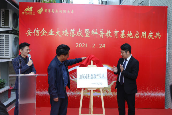 2月24日,“汕尾市科普教育基地工作交流会暨科普教育基地揭牌仪式”在安信新基建(广东)有限公司举行。汕尾市人大常委会副主任、市科协主席黄宏伟出席并讲话,汕尾市科协党组书记、常务副主席杨敏文,市科协专职副主席柯梁恭等领导共同为安信新基建(广东)有限公司科普教育基地揭牌。汕尾市城区科协领导及汕尾市各科普教育基地相关负责人出席了活动。