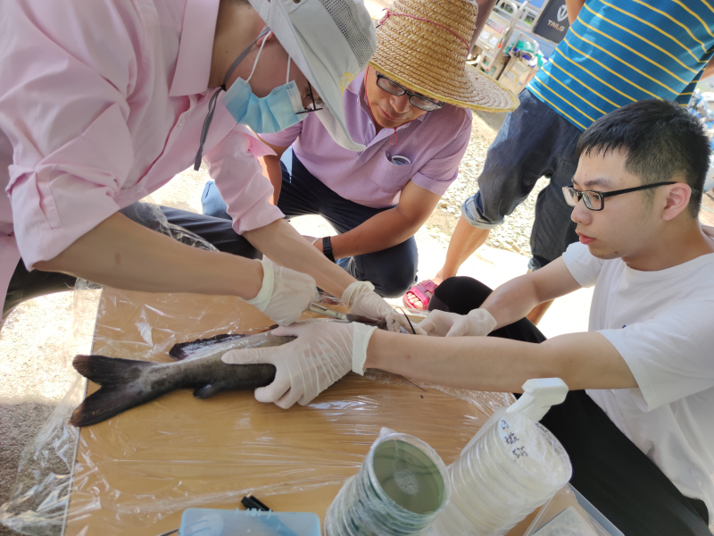 秦启伟院长受汕尾市科协所托,委派华农海洋学院魏京广教授带领科技团队,于5月26-27日带着检测检验设备实地为该公司碰到的养殖问题 “把脉开方”。一行人实地察看了公司养殖基地,抽取了养殖池的水样和部分鱼进行化验。专家们根据现场的诊断和化验结果,随即精准开出了“诊治良方”,通过采取有效的补救措施,帮助公司及时挽回经济损失。