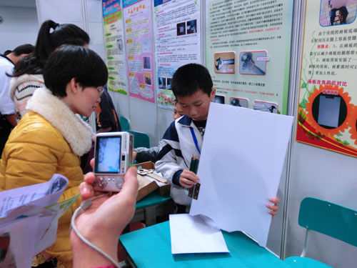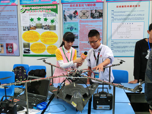 图为汕尾市参赛学生在展评现场解说其作品原理