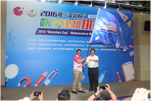 8月17日上午,2016年“深圳杯”数学建模挑战赛开幕仪式在南方科技大学第一科研楼110报告厅举行。深圳市人大常委会副主任、市科协主席蒋宇扬,全国大学生数学建模竞赛组委会副主任、专家组组长、浙江大学教授陈叔平,深圳市科协党组书记、副主席张莉,南方科技大学副校长汤涛,全国大学生数学建模竞赛组委会秘书长、专家组副组长、清华大学教授谢金星,深圳市科协副主席张治平,深圳市政协委员、深圳市尚龙数学技术中心发起人李毅以及本届数学建模挑战赛组委会专家组成员、全体参赛队员及领队近300人出席开幕仪式。蒋宇扬宣布挑战赛开幕并向汤涛授旗。