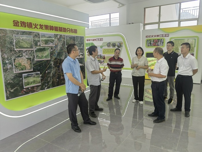 交流学习人员先后参观了金鸡镇石龙村火龙果种植基地、石龙火龙果展厅。秦永华教授实地深入果园进行调研并和基地负责人面对面交流,针对基地种植情况和植株生长问题,从植株根、茎等将火龙果种植技术和管理方面做了交流讲解,并提出种植品种、病虫害防治、种植管理等方面的建议。在金鸡镇政府会议室,交流学习人员还与镇政府、驻镇帮镇扶村工作队有关负责人、火龙果种植户代表,就火龙果产业发展进行座谈交流,听取全镇火龙果产业发展情况介绍,对种植品种、管理技术、科技培训、劳工服务、基地管理、基地配套设施等进行了深入的探讨,对罗定市申请设立火龙果科技小院进行了研讨交流。通过学习交流经验、探讨生产发展,共同寻求技术服务、引进品种等方面合作,有效促进了火龙果产业壮大发展。
