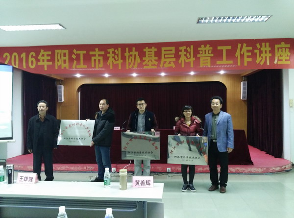 在培训班上,市科协对被命名为“阳江市科普教育基地”的阳江市光明眼科医院和阳西县漠阳民间艺术馆,以及被命名为“阳江市农村科普示范基地”的阳江市灵蜂宝生物工程有限公司进行了授牌。